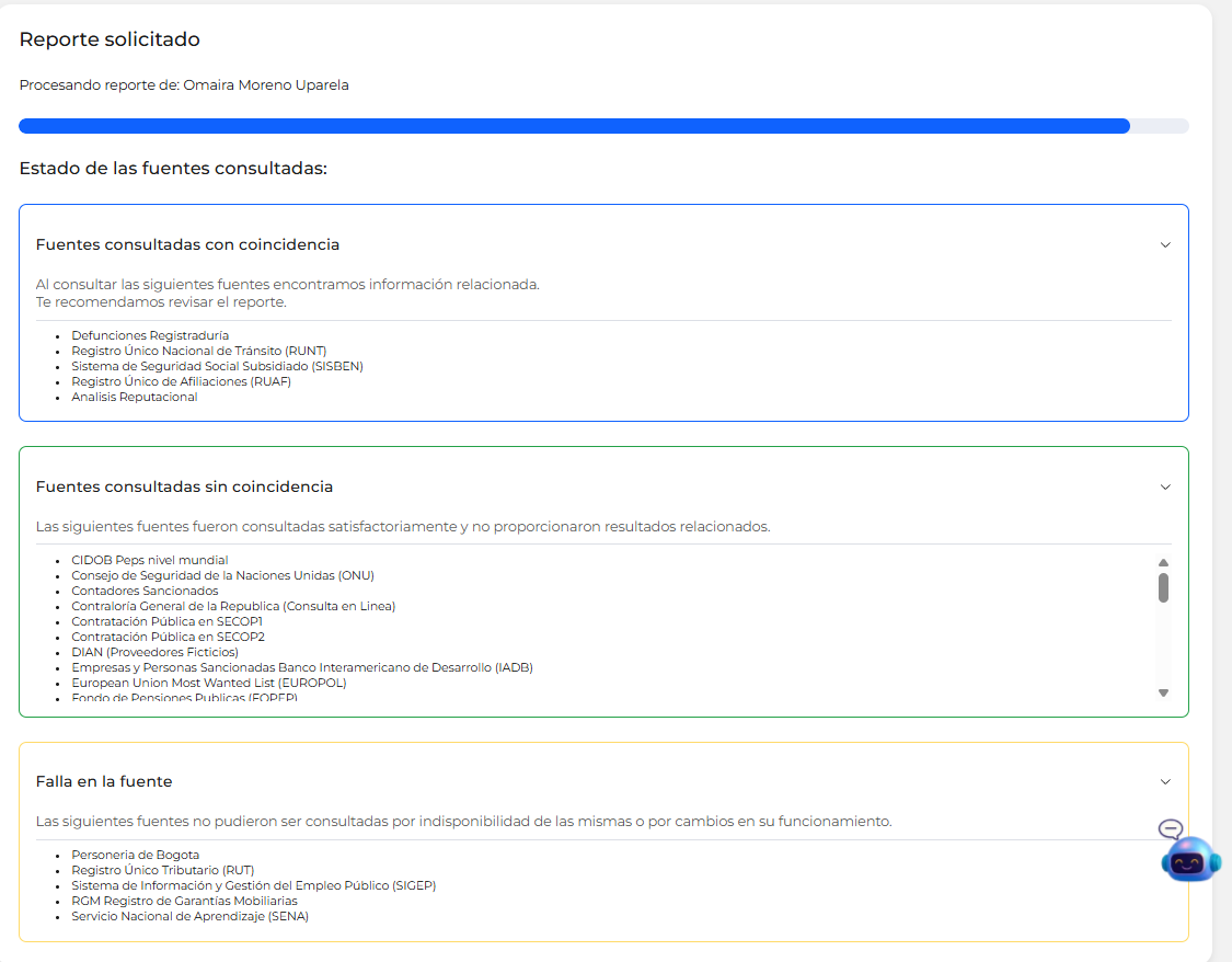 Al generar una consulta de cualquier tipo de documento, se desplegará un pestaña con el progreso tu la consulta, debajo de esa pestaña aparecerán unas tarjetas de colores que indican el estado de las fuentes que hemos consultado.