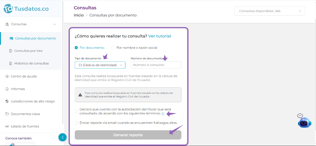 3. Diligencias el número de cédula de identidad de la persona o el RUC de la empresa que deseas consultar y finalmente da clic en "Generar reporte"