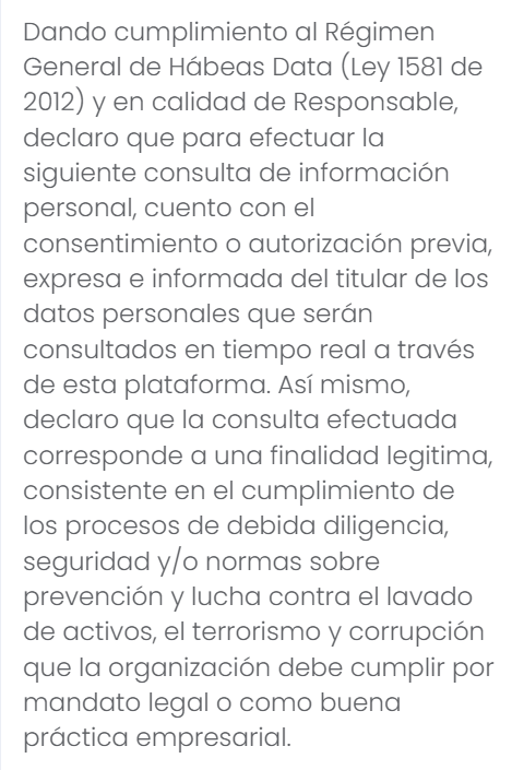 Esta opción te permitirá marcar si cuentan con la autorización del titular del documento para realizar una consulta individual. Es importante tener en cuenta que si esta opción no se marca, la consulta individual no podrá ser procesada.