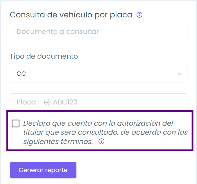 Sí, es necesario confirmar en el checkbox si se cuenta con la autorización para obtener información sobre el vehículo, ya que, para iniciar una consulta de vehículos se requiere el documento de identidad del dueño del vehículo, esta medida no aplica si el titular tiene documento NIT.