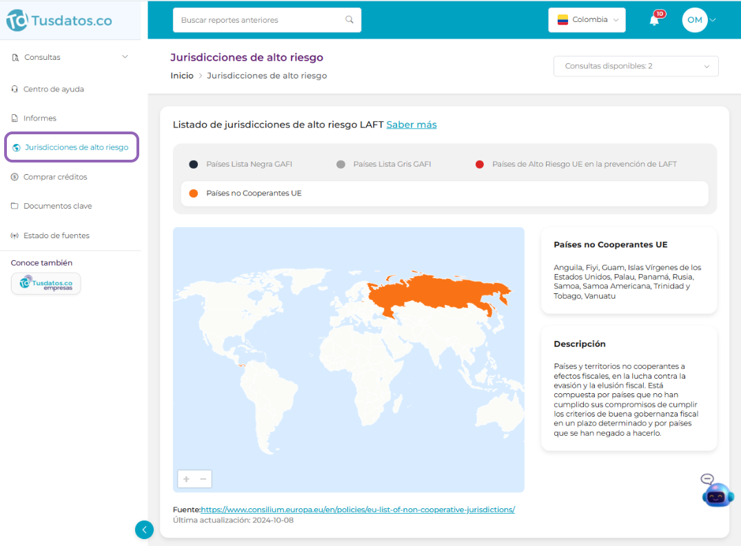 Ahora en la plataforma de Tusdatos podrás explorar un mapa interactivo que te permitirá identificar rápidamente las jurisdicciones de alto riesgo en el marco de LA/FT. Este se encuentra ubicado en el costado izquierdo de la plataforma.